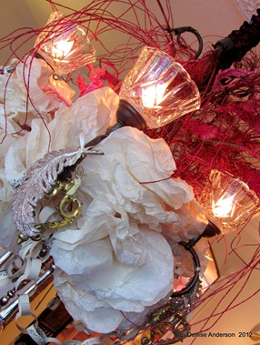 These were the party favors given to each person, a valentine party ball, a mini suitcase with pink wafers inside, lock & key hearts, and a beautiful wooden box with sundries inside and a painted rose by Sandra Feazel